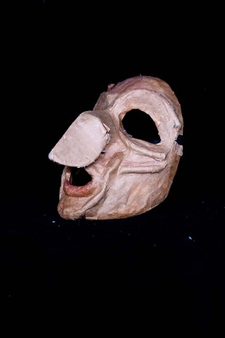 Maska Neli Brzezińskiej - Starucha z krowią czaszką, zainspirowana znalezioną w lesie czaszką łosia. Lewy profil